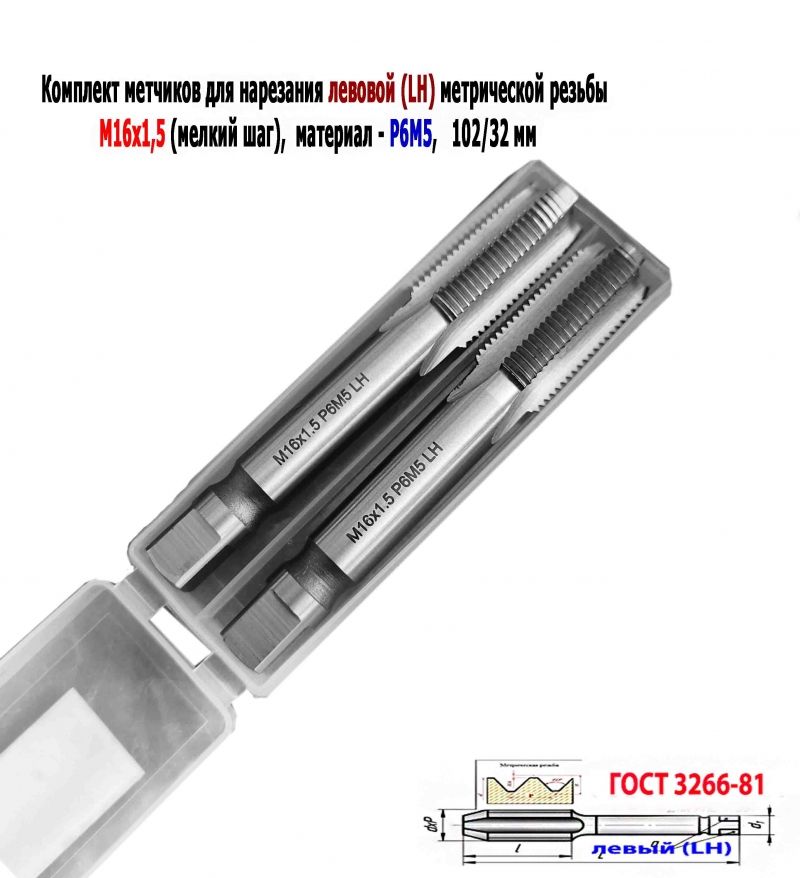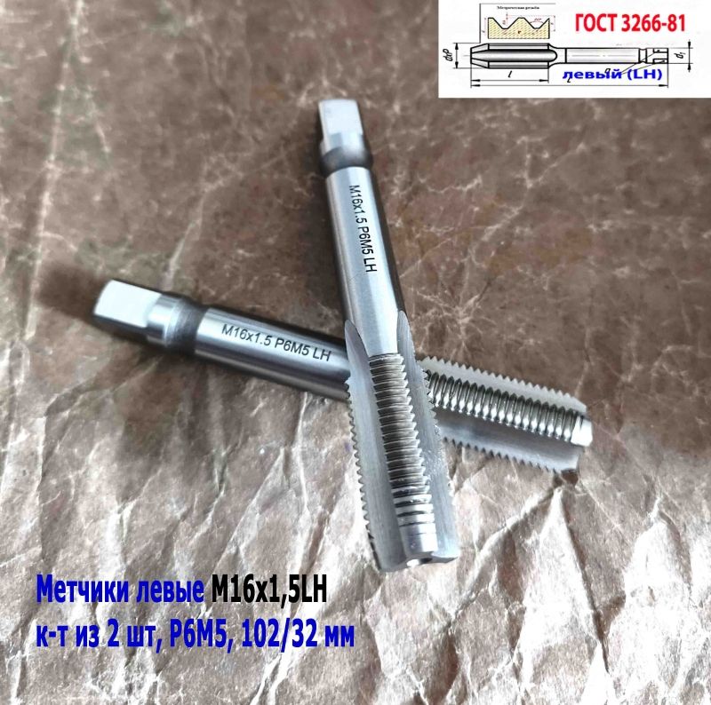 Метчик левый М16х1,5LH; к-т, Р6М5, м/р, 102/32 мм, мелкий шаг, ГОСТ 3266-81, исполнение 2.