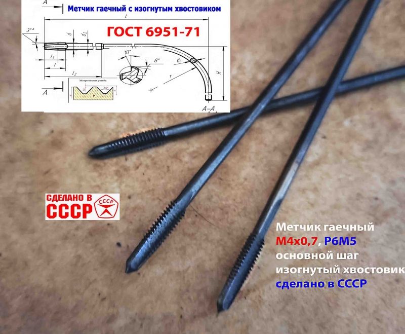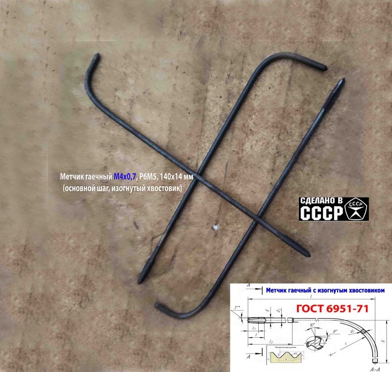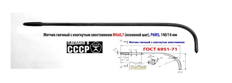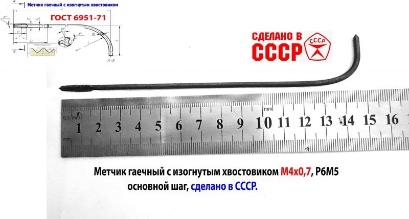 Метчик длинный М4х0,7, гаечный, изогн. хвост, Р6М5,140/14 мм, основной шаг, 2640-0021, ГОСТ 1604-71, сделано в СССР.