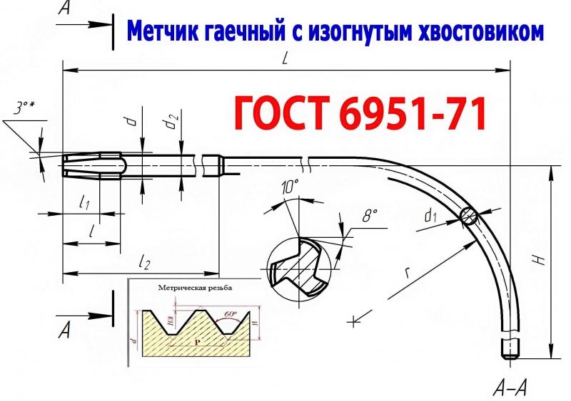 Метчик гаечный с изогнутым хвостовиком (длинный, L-240 мм), имеющий рабочую часть изготовленную из быстрорежущей стали Р6М5, предназначен для нарезания гаек с метрической резьбой по ГОСТ 24705-81 станках-автоматах с непрерывным циклом.
