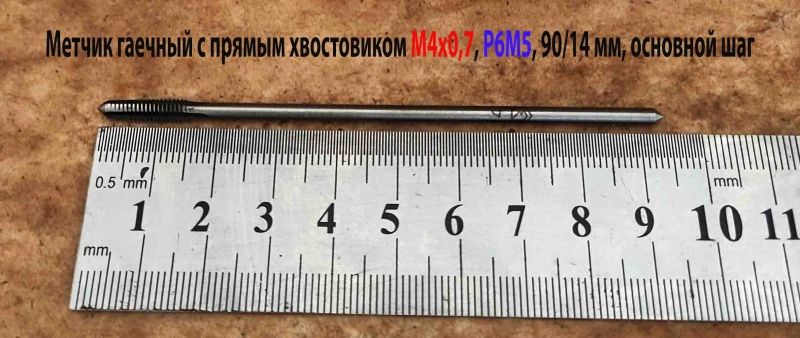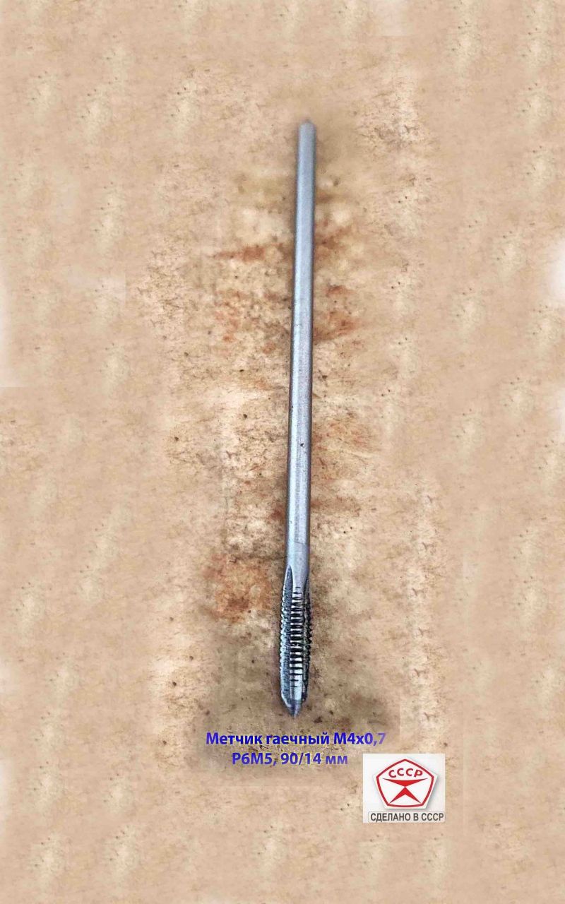 Метчик гаечный длинный М4х0,7, Р6М5, 90/14 мм, прямой хвостовик, основной шаг, 2640-0021, ГОСТ 1604-71, СССР.